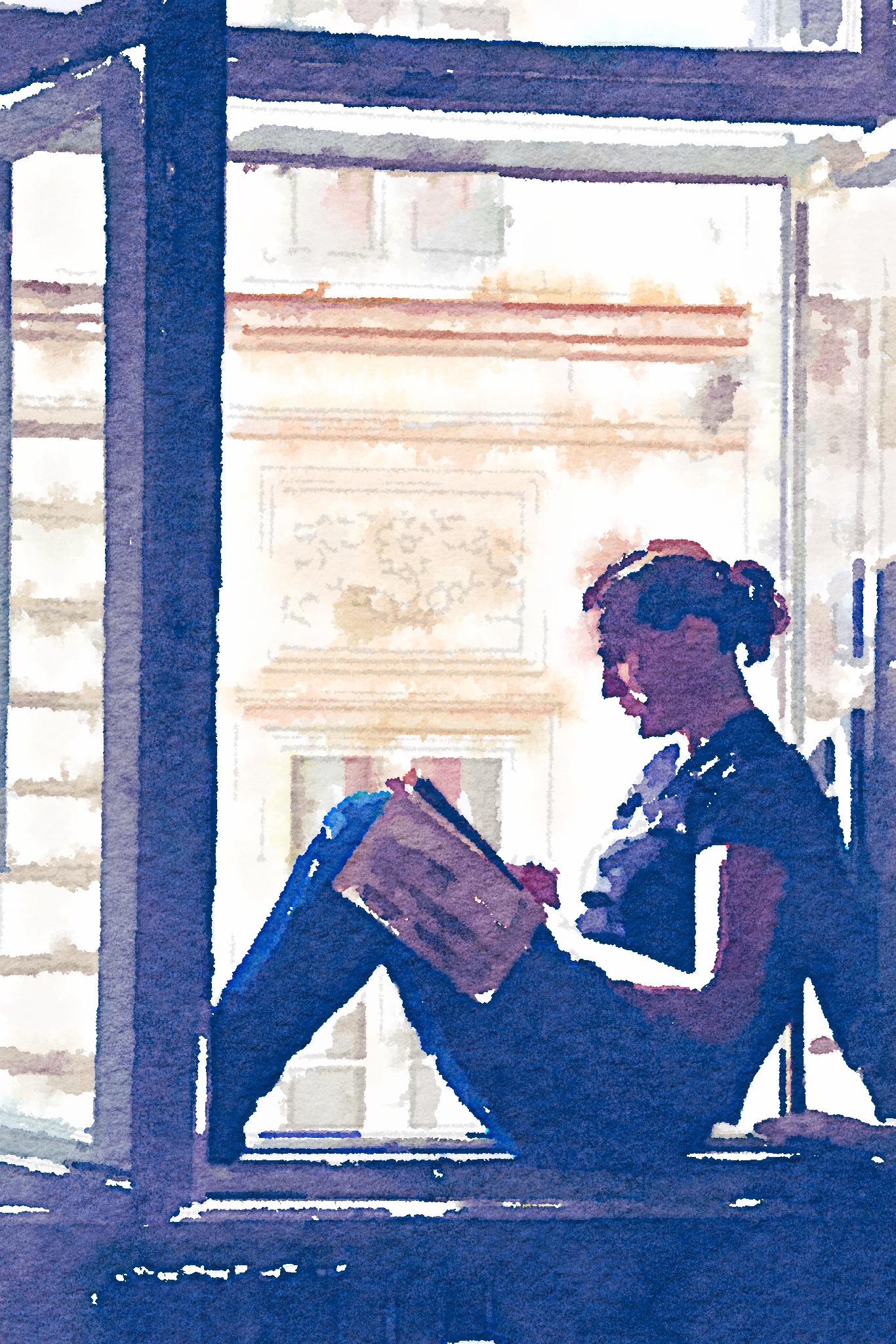 Natasja & her iPad, in the window of our Prague Hostel, 2013