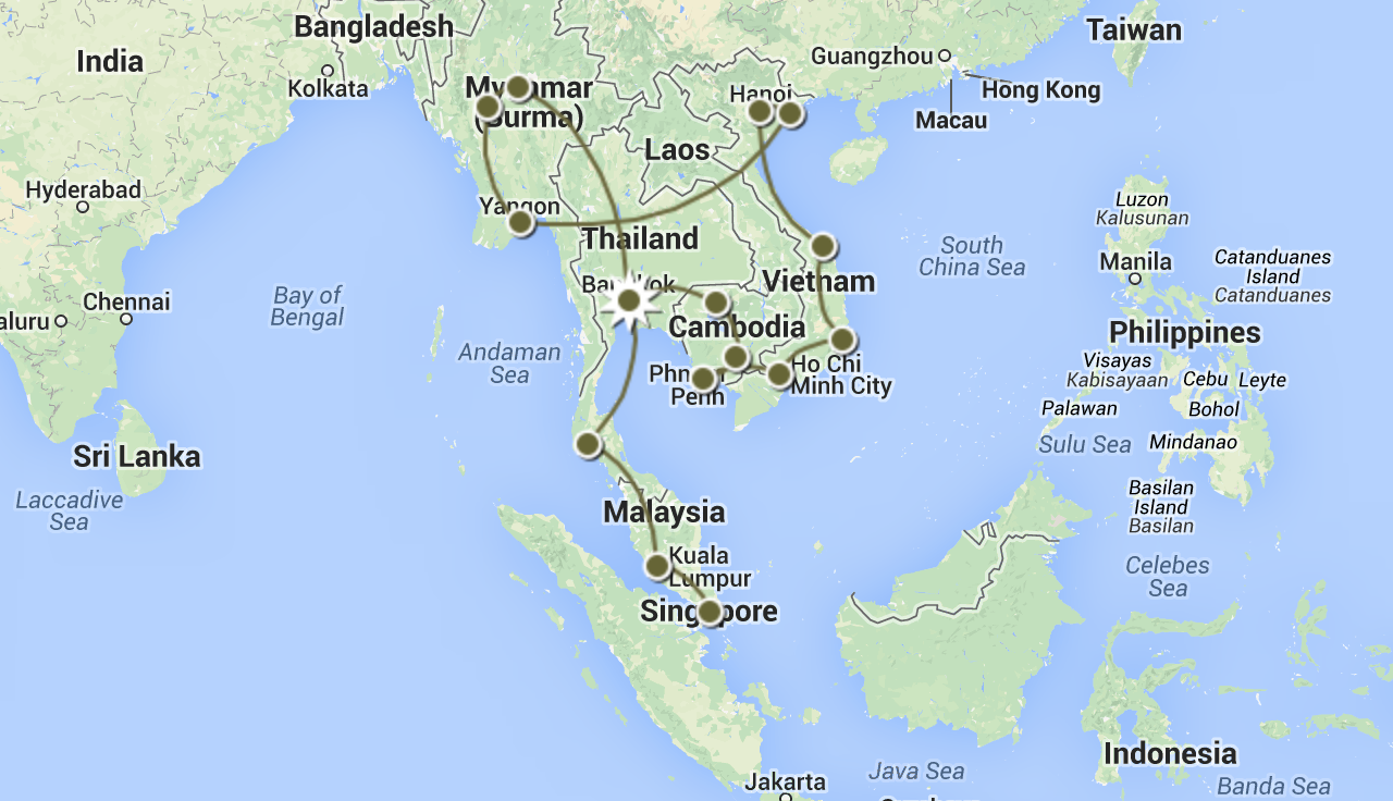 Next up, I’ll fly in to Bangkok (the star in the map below) from Tokyo and then start traveling counter-clockwise and then head down the peninsula to Singapore!